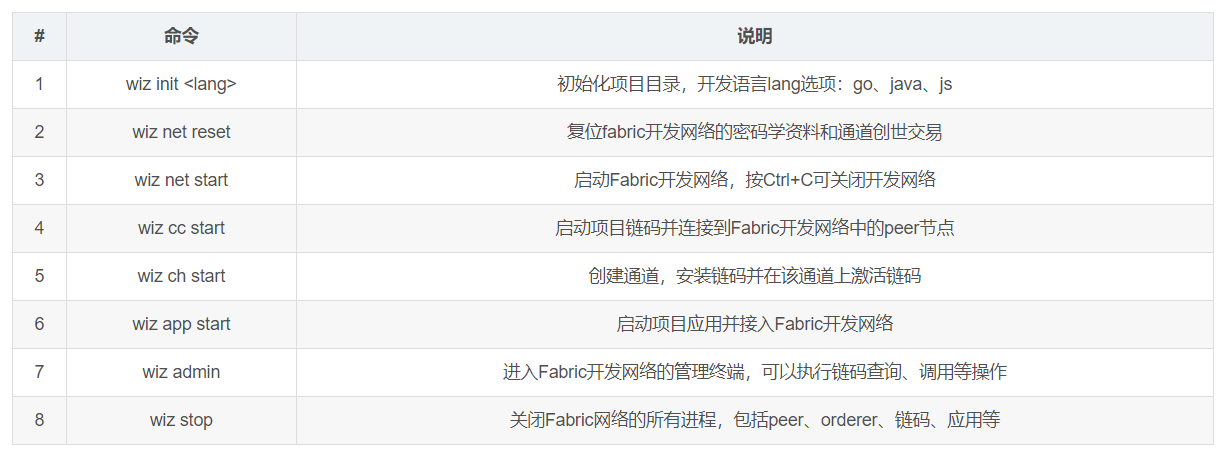 - 支持Fabric区块链链码和应用开发流程的完整命令集