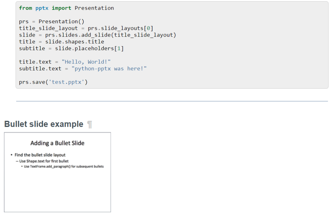 pandas是大家都熟悉的数据处理利器,它也支持excel的读写,接口友好。这个后面会讲到。 如果你对python自动化处理excel很有兴趣,也可以买一本专门的教材来看。 ppt自动化 python当然是支持ppt的自动化处理,主要的库有pywin32com、pptx,可以创建、修改ppt文件。 推荐使用pptx库,目前主流的ppt处理库。