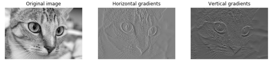 它们能在真实的图像上发挥作用吗?在例 8-1 中,我们使用图 8-4 所示的猫的水平和垂直梯度上来实验。由于梯度是在原始图像的每个像素位置计算的,所以我们得到两个新的矩阵,每个矩阵可以被可视化为图像。