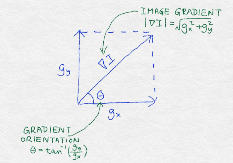向量可以通过它的方向和大小来完全描述。梯度的大小等于梯度的欧几里得范数,这表明像素值在像素周围变化得多大。梯度的位置或方向取决于水平方向和垂直方向上的变化的相对大小;图 8-2 说明了这些数学概念。