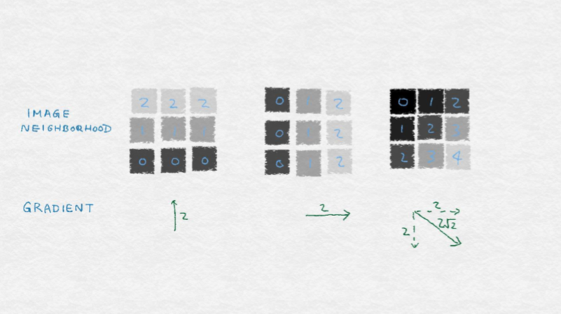 要比原始像素值做得更好,我们必须以某种方式将像素组织成更多信息单元。相邻像素之间的差异通常是非常有用的特征。通常情况下像素值在对象的边界处是不同,当存在阴影、图案内或纹理表面时。相邻像素之间的差值称为图像梯度。