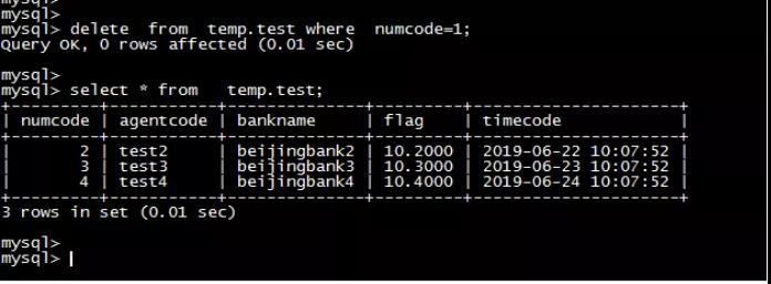 - 删除 temp.test 表中 numcode=1 的这条记录