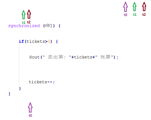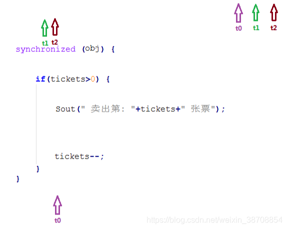 进入同步代码块,执行同步代码,,假设t0在执行过程中没有被t1或者t2抢夺cpu资源,那么t0或顺利执行完同步代码块内代码,退出同步代码块,释放锁资源,继续和其他线程抢夺cpu资源和锁对象。