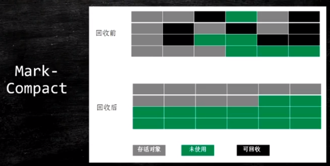 (3) 标记压缩(mark compact):这种方式就是在清理垃圾的同时,将同类型的内存空间放置在一起,也就是说在清理的同时进行空间整理,并且多线程时还需要进行线程同步,所以这种方式明显的缺点就是效率偏低。