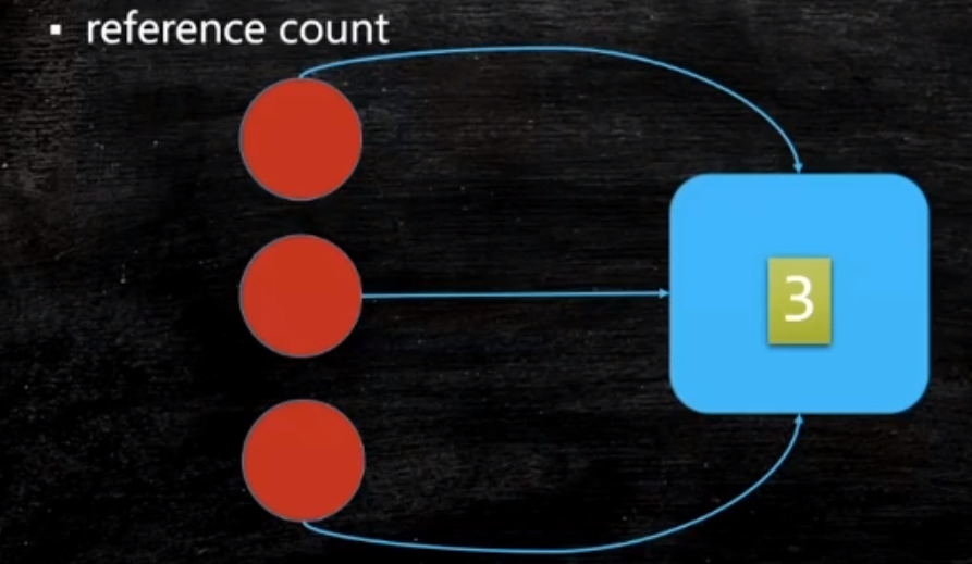 (1) 引用计数(Reference Count):每当一块内存被一个对象引用,那么计数就+1,当没有对象指向时,计数为0,就表示这块内存可以被回收了,如下图: