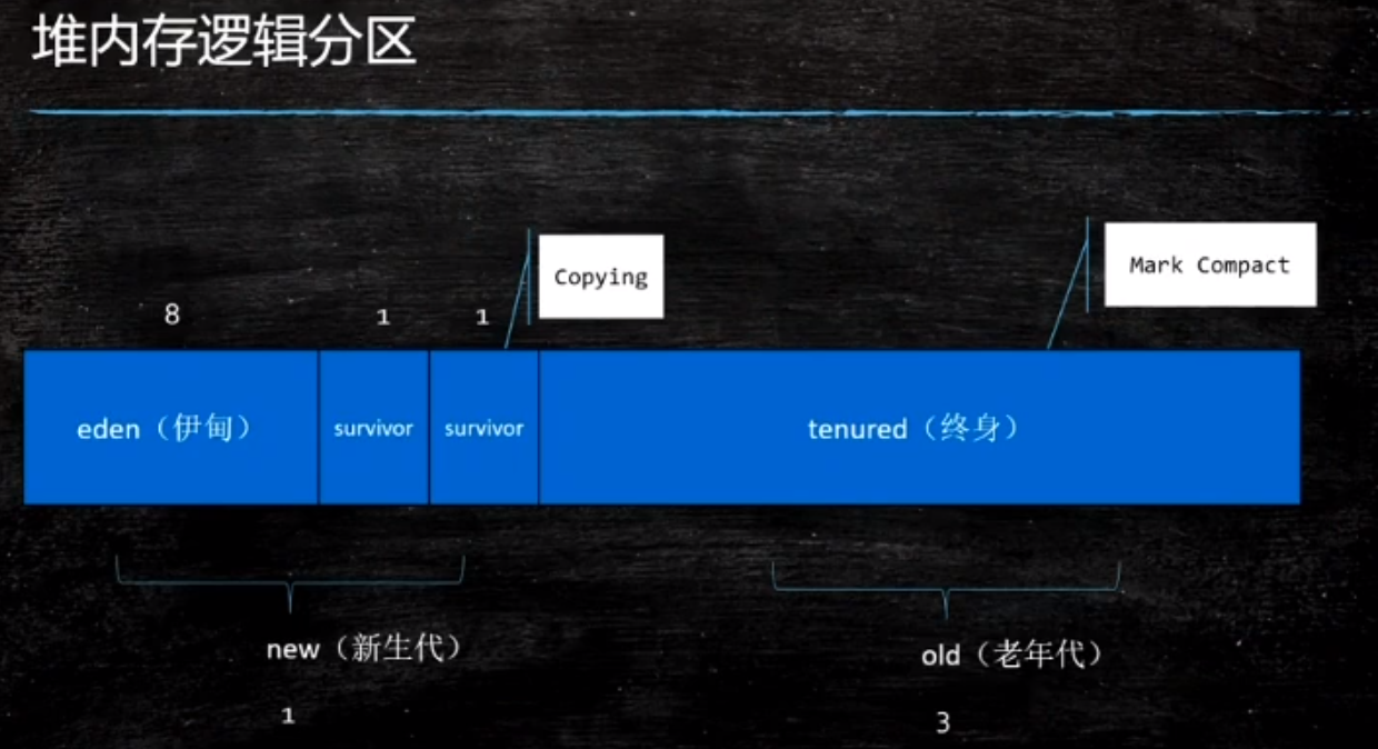 分代模型在逻辑上分代,在物理层面也就是内存中也是分成了new(新生代)和old(老年代)两个大区域。新生代区又详细分为eden(伊甸园)、survivor1和survivor2。new(年轻代)的对象有两大特点:大量产生;大量回收(大多数情况下,一次回收90%的对象)。所以根据new年轻代的特点,采用的算法是Copying算法;而Old老年代则是采用标记压缩(mark compact)算法,以此保证内存的连续性 。
