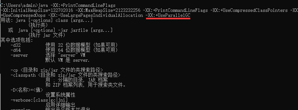我们可以用命令行-XX:+PrintCommandLineFlags查看我们所使用的是哪种垃圾回收器,如下图: