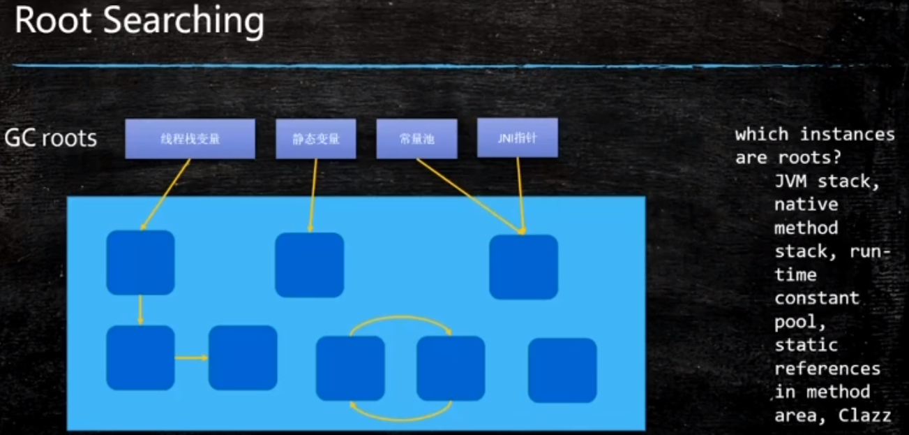 那么哪些对象是根对象呢?主要包含:JVM stack,native method stack,run-time constant pool(运行常量池里的对象),static references in method area(方法区里的静态引用),Clazz等。