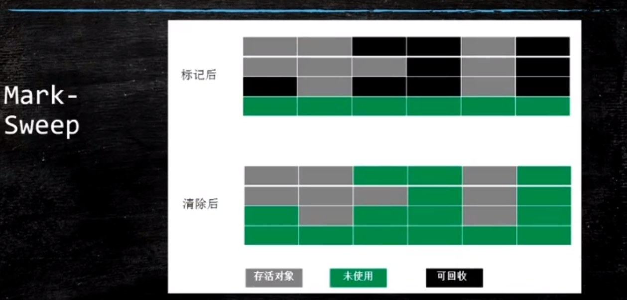 (1) 标记清除(mark sweep):就是将找到的垃圾标记出来,然后直接清除掉。但是这种方式有一个严重的毛病,会使得内存变得碎片化,也就是有多个不连续的内存。