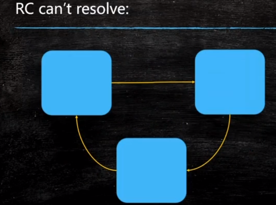 但是引用计数没办法解决垃圾之间互相引用的情况,当几块内存都没有外部引用,但是这几块内存之间相互引用的时候,这几块内存也应该视为垃圾,但是引用计数却不为0,如下图: