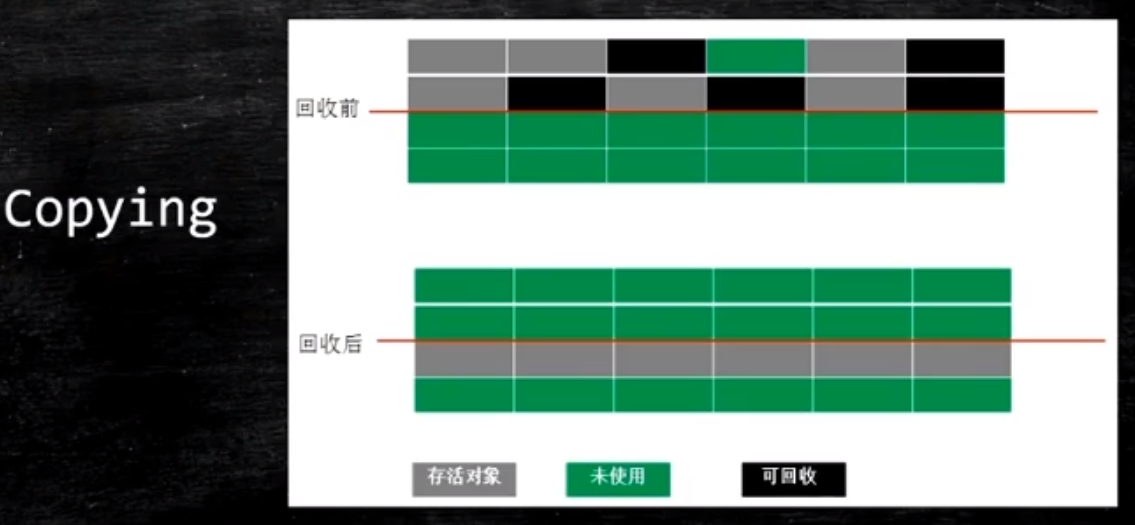 (2) 拷贝算法(copying):这种方式的做法就是将内存平分成两块,在使用的过程中只能在其中一块内存里创建对象,当需要垃圾回收时,将有对象的内存全部复制到另一边,并且将当前区域全部清除。这种方式解决了内存碎片化的问题,但是却浪费了空间,因为每次只能利用一半。