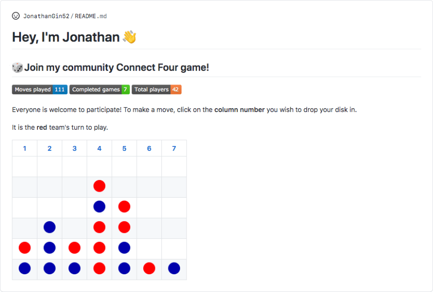 GitHub 简介出现游戏只是时间的问题,@jonathangin52[11] 是一个好榜样 ???? ❤️这款社区主导的 Connect4 可以做你想到任何事。