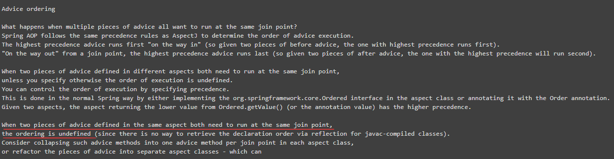同一个切面类里的两个相同类型的增强处理在同一个连接点被织入时,Spring AOP将以随机的顺序来织入这两个增强处理,没有办法指定它们的织入顺序。即使给这两个 advice 添加了 @Order 这个注解,也不行!