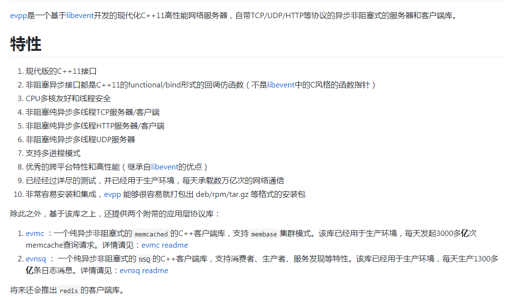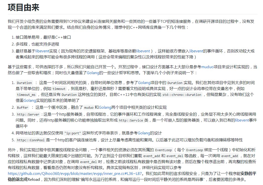 evpp是奇虎360内部使用的开源多线程网络库,集tcp/udp/http多种协议的服务器和客户端支持。github代码路径是:https://github.com/Qihoo360/evpp,可以不依赖boost库,使用现代c++14语言(evpp/invoke_timer.cc的lambda表达式使用到了c++14的特性)进行编码。本项目高度参考了muduo网络库,而底层使用现成的libevent库作为事件驱动库,典型的一个reactor网络编程模式的例子,本文就是通过分析evpp源码来达到学习c++网络编程的效果。