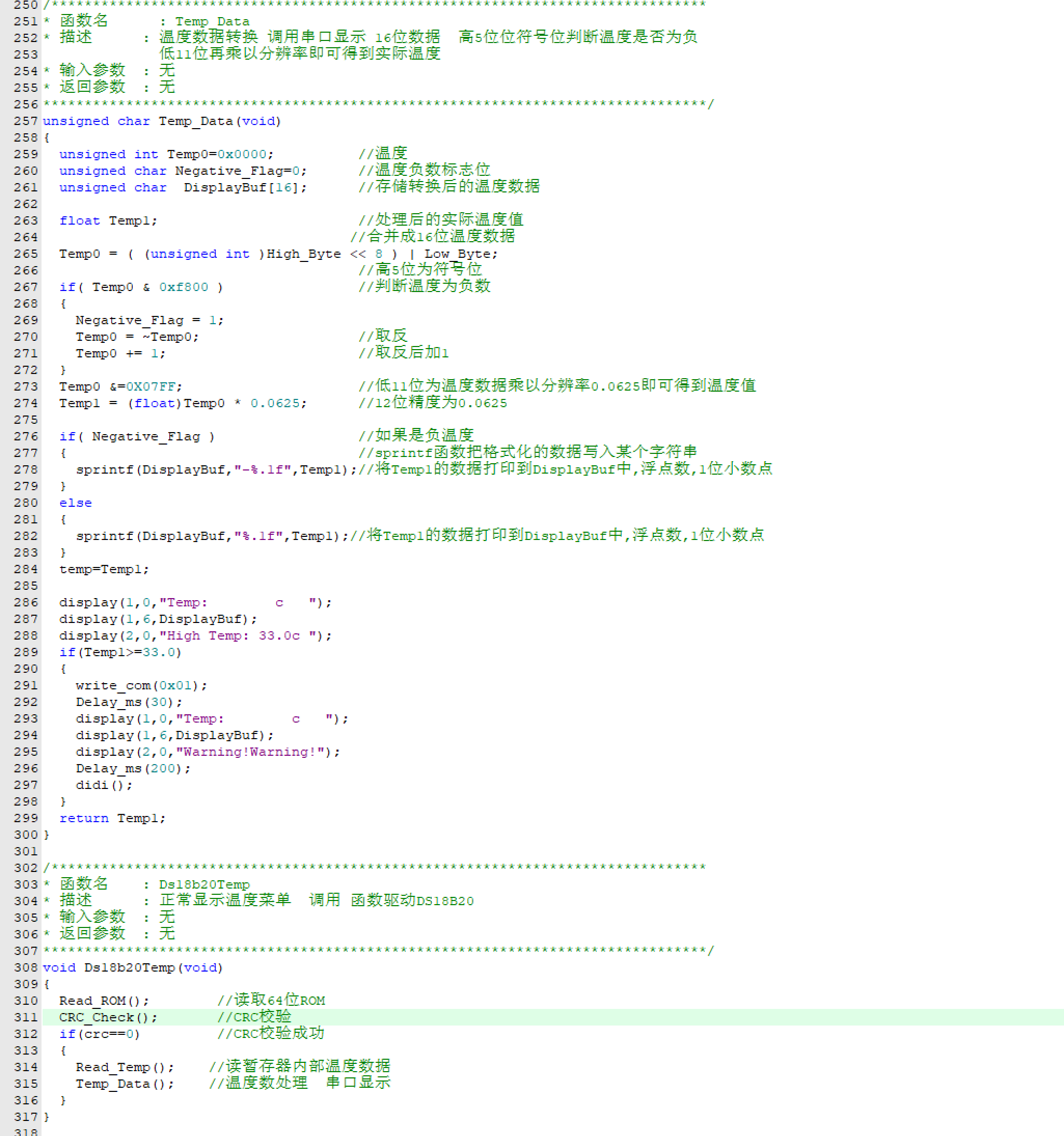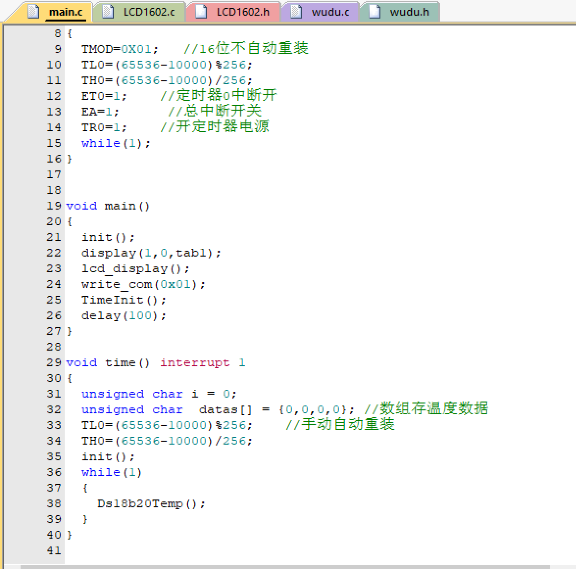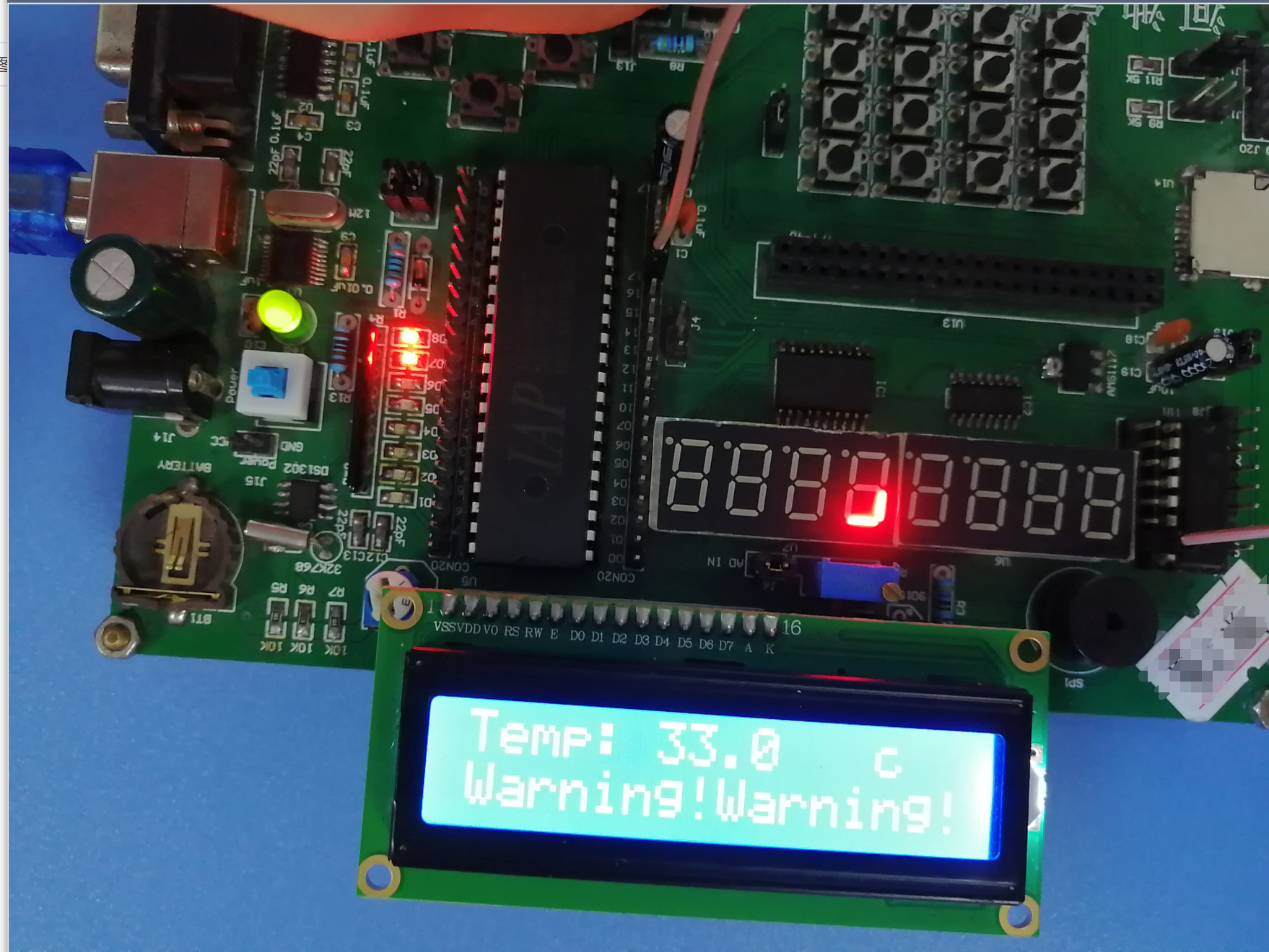 - 当倒计时结束后,采用定时器中断进入温度检测模块,在1602液晶显示屏实时显示当前温度,并设置了上限温度,当到达上限温度时,蜂鸣器进行鸣叫提示,同时1602液晶显示屏闪烁显示当前温度和报警显示;