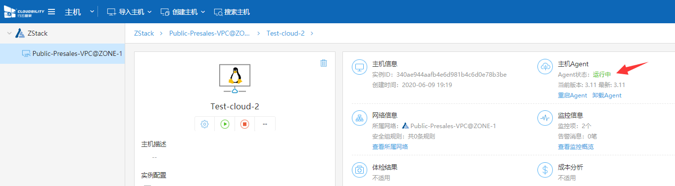 安装结束后,在行云管家接管的虚拟机详情页,agent状态为“运行中”,如图3-9所示。