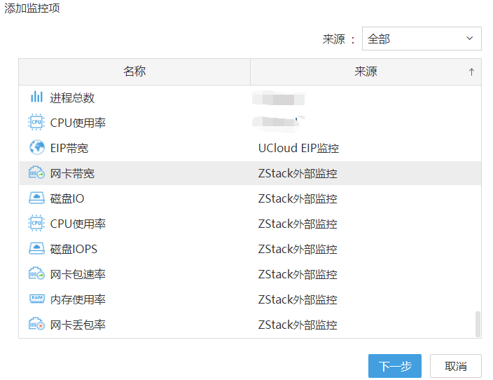 行云管家针对ZStack虚拟机的监控分为两种。第一种为行云管家agent,原理与ZStack云平台“内部监控”原理一致,都是通过安装agent从虚拟机中获取监控数据。第二种为ZStack外部监控,主要原理为调用ZStack云平台本身的外部监控API,获取ZStack云平台外部监控数据,ZStack云平台外部监控的原理为使用Libvirt从物理机采集云主机的CPU、内存、磁盘IO和网络相关数据。监控项如图4-1所示。