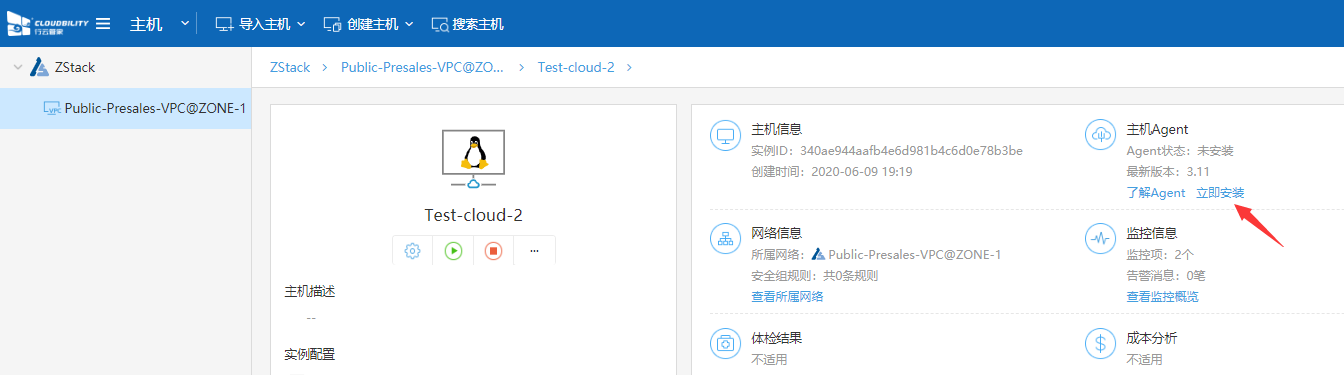 在需要安装agent的ZStack虚拟机页面,选择“立即安装”,如图3-7所示。