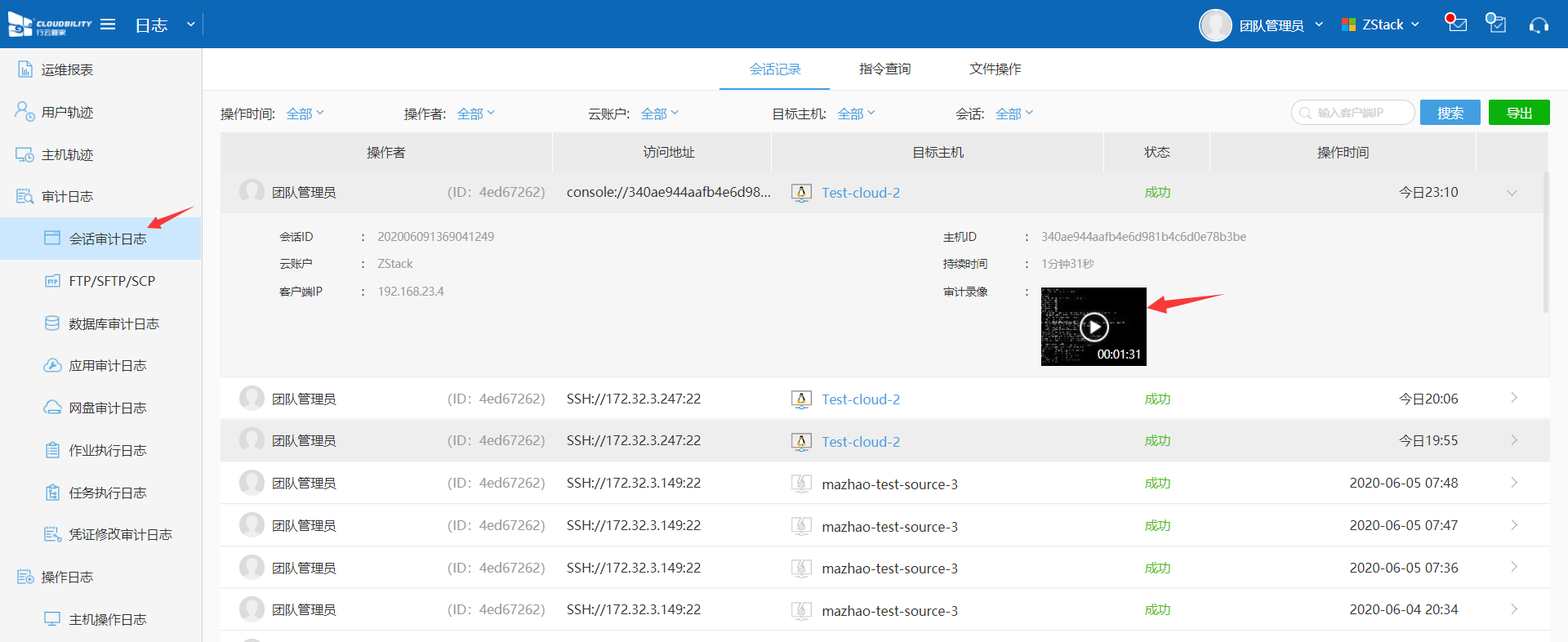以“会话审计日志”为例,如图7-1所示,会话审计列表展示了所有用户的主机会话访问记录。当开启“录像审计”后,用户的每次会话访问操作均会被录像记录,录像可在线播放,也可离线下载。