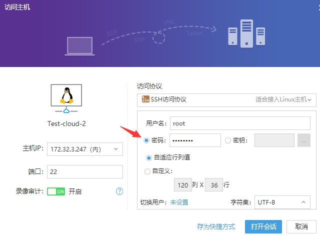 进入跳板机页面后,可以看到在行云管家中接入的所有ZStack虚拟机。跳板机模式中,可以进行SSH会话的虚拟机仅限于与行云管家门户虚拟机网络可达的虚拟机。如图3-17所示,配置好目标虚拟机的ssh账号密码后,即可进行会话访问。