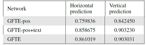 首先,作者对比了不同 GFTE 模型的效果。第一步,对 GFTE-pos 进行训练,即利用相对位置和 KNN 算法生成图,只利用位置特征训练 GFTE。第二步,利用 LSTM 获取的位置特征和文本特征对网络进行训练,该模型标记为 GFTE pos+text。最后,在网格采样的基础上,进一步加入图像特征,训练得到本文提出的 GFTE。表 4 给出了不同 GFTE 模型在 FinTab 数据集上的性能。当引入更多种类的特征时,准确度总体呈上升趋势。当加入文本特征时,准确度有明显的改善,即水平预测和垂直预测分别提高了 10% 和 5%。进一步加入图像特征仍能继续提高性能,但提高的程度不会太大。