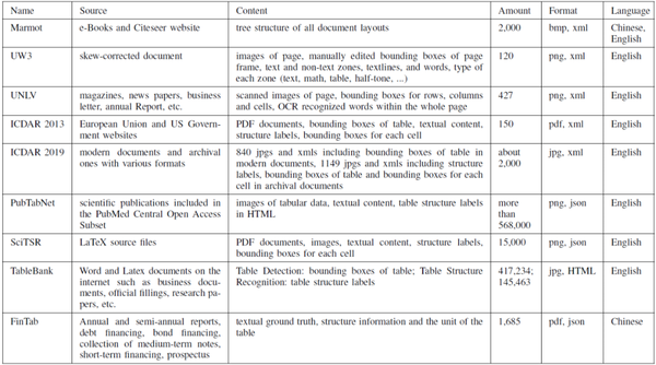 (6)SciTSR[7]。SciTSR 是一个综合性的数据集,由 15000 个 PDF 格式的表格、表格区域的图像、它们对应的结构标签和每个单元格的边框组成。其中,12000 个文档用于训练,3000 个用于测试。同时,还提供了一个称为 SciTSR-COMP 的复杂表列表。