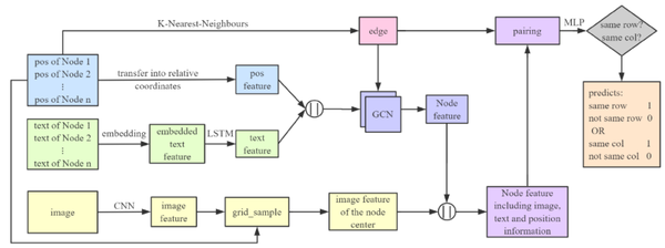 图 5 给出了基于图的卷积网络 GFTE 的结构。首先将绝对位置转换为相对位置,然后用这些位置来生成图。同时,将纯文本嵌入到预先定义的特征空间中,然后使用 LSTM 来获取语义特征。将位置特征和文本特征连接在一起,并将它们传送到一个两层图卷积网络(GCN)。同时,作者使用了一个小内核算子对图像进行膨胀,使表格的线条更粗。还将图像调整为 256x256 像素,以便使输入的图片正常化,然后利用三层 CNN 计算图像特征。最后,利用节点的相对位置,计算出流场网格。利用网格中输入的像素位置计算输出,可以得到某个节点在某一点上的图像特征。这三种不同的特征都得到后,将生成的图的一条边上的两个节点配对,即,找到一条边上的两个节点,并将它们的三种不同的特征集合在一起。最后,使用 MLP 来预测两个节点是在同一行还是在同一列中。