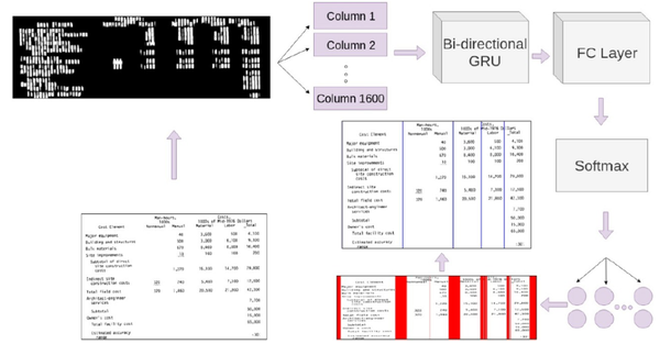 具体的预处理过程包括:去除掉图像中的划线和其它非文本的前景对象,对清理后的图像进行自适应二值化处理,使像素强度均匀。图像二值化处理后,尺寸调整为 1600x512 以便于后续输入神经网络处理。使用矩形核对调整后的图像进行三次膨胀变换(Dilation Transform)。在列检测的情况下,膨胀核(Dilation Kernel)是维数为 3x5 的垂直膨胀滤波器,在行检测的情况下,它是维数为 5x3 的水平膨胀滤波器。通过这些膨胀变换处理,能够连接表格中相邻的行和列,从而有助于模型获取行和列分隔符的模式。然后,将变换后的图像标准化,使其值介于 0 和 1,以将其输入到后续的递归神经网络。
