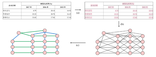 GFTE 可以概括为以下步骤:(a) 构建基本事实,包括表格区域的图像、文本内容、文本位置和结构标签。(b) 基于单元格构造一个无向图 G=<V, R_C>。(c)使用 GFTE 来预测相邻关系,包括垂直关系和水平关系。表 3 给出一个任务示例(表格文字已经转换为英文)。