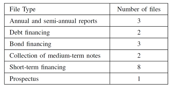 作者分析,现有的应用于表格识别任务中的数据集存在下述两个问题:1)从财务文档中提取表格信息的方法和标准数据集很少。2) 表格信息提取的来源缺乏多样性。本次发布的基准数据集 FinTab 旨在解决上述问题。在这个数据集中,总共收集了 19 个 PDF 文件和 1600 多个表格。具体文件分类见表 2。所有文件总计 3329 页,其中 2522 页包含表格。为了保证表格类型的多样性,除了表格的基本形式外,FinTab 中还包括了不同难度的特殊表格形式,如半规则表格、跨页表格、合并单元格表格、多行标题表格等。FinTab 中共有 119021 个单元格,合并单元 2859 个,占 2.4%。