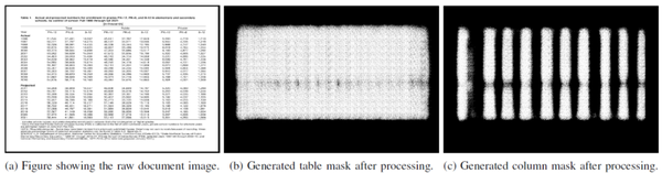 本文使用从各种来源下载的免费文档图像作为神经网络的训练数据集。表格、行和列是使用自定义工具手动标记的。固定学习速率为 0.0005。作者训练了 323 幅图像中的 10 次迭代的列分类器和 286 幅图像中的 35 次迭代的行分类器。