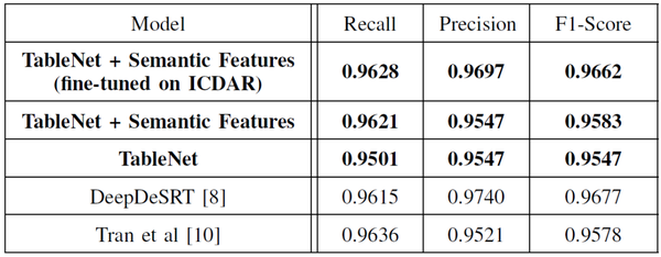 [10] S. Schreiber, S. Agne, I. Wolf, A. Dengel, and S. Ahmed, “Deepdesrt: Deep learning for detection and structure recognition of tables in document images,” in Document Analysis and Recognition (ICDAR), 2017 14th IAPR International Conference on, vol. 1. IEEE, 2017, pp.1162–1167.