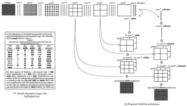 图 1:(a)来自 Marmot 数据集的训练样本图像,突出显示了文本;(b) TableNet:该模型由 VGG-19 作为基础网络的预训练层,从 conv1 到 pool5 的层用作表格和列图的通用编码器层,编码器层后的两个解码器分支 conv7 column 和 conv7 table 生成单独的表格预测和列预测结果