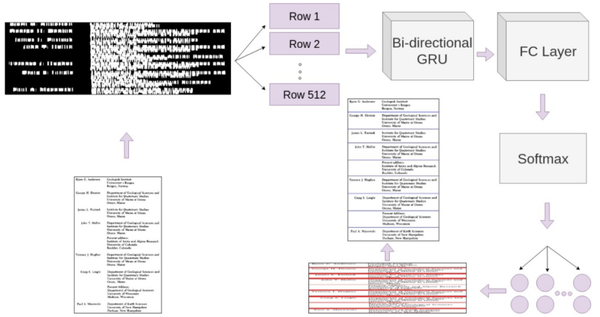 2) 行分类:行分类器的结构是列分类器的转置,它将图像的每一行分类为一行或两行之间的空白。每次输入一个图像,每个图像被视为一个批次。在一个批次中,将尺寸为 1600x512 的预处理输入图像划分成 512 个序列(行),每个序列由 1600 个像素值组成。两层 GRU 初始化为隐藏维度(4 x 1 x 1024),对应于“2 x 层数 x 批次大小 x 隐藏维度大小”。