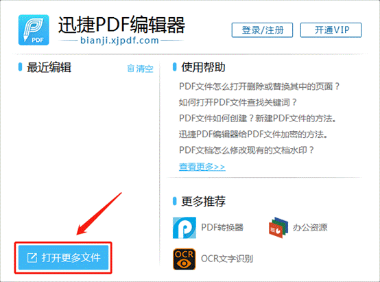第一步:下载、安装好“迅捷PDF编辑器”后,双击运行软件。在打开的软件页面中,点击【打开更多文件】蓝色按钮,把需要添加高亮文本的PDF文件打开。