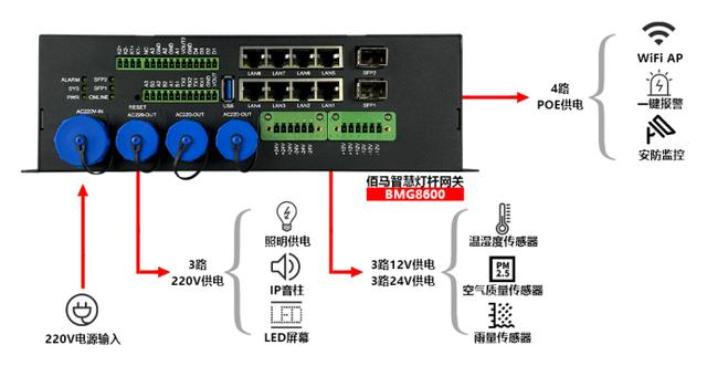 BMG8600智能网关配置POE、220V、24V、12V四种供电输出电压,为灯杆上的摄像头、WiFi AP、各类传感器、照明、音柱灯杆设备提供电源,无需再另外供电,摒弃杂乱的电源适配器,简化施工部署,节约成本,降低后期维护难度。