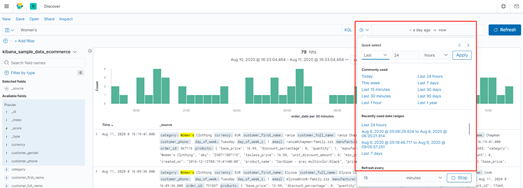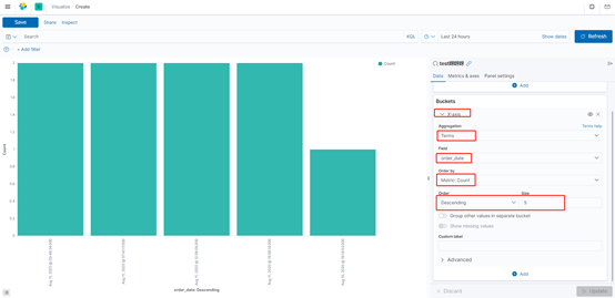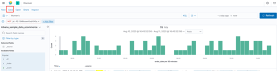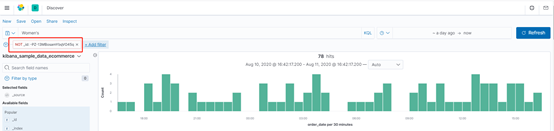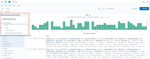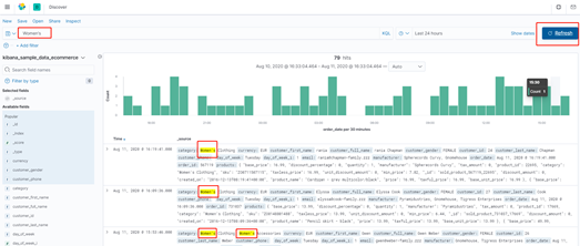 - 使用一下kibana查看索引数据。点击左侧边栏【Discover】,利用索引查找数据。可以在搜索框输入关键字,点击【Refresh】,搜索所要数据。