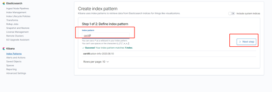 - 输入索引名字,可以支持模糊查询字符 *,注意不能使用空格和特殊字符 \, /, ?, ", <, >, |.。点击下一步【Next step】