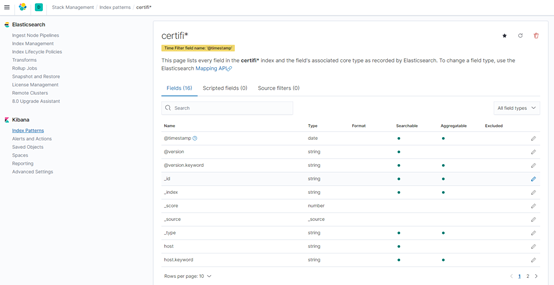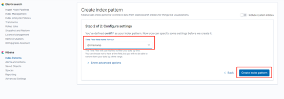 @timestamp字段。点击【Create index pattern】。索引创建成功。