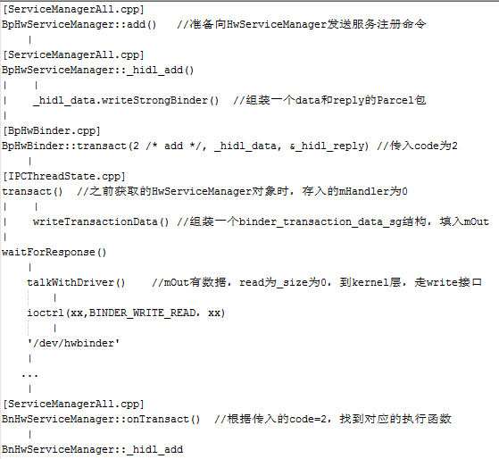 3.调用HwBpServiceManager的_hidl_add,组装一个Parce数据,传入服务名称、服务实体对象--BHwBinder、执行2 /* add */