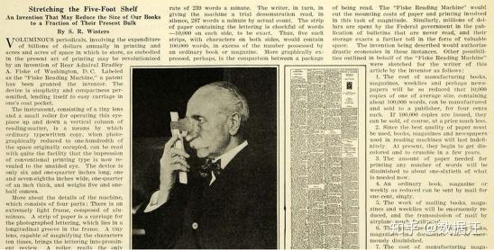 究其原因,还是生不逢时,菲斯克在捣鼓来捣鼓去他的阅读机时,缩微胶卷开始流行起来了。虽然微缩摄影在19世纪50年代末首次出现,但直到20世纪20年代它才开始被用作信息存储媒介。