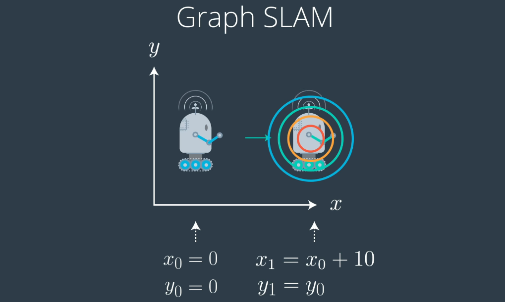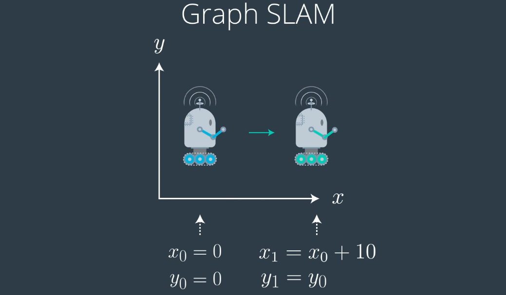 同时定位和地图绘制(SLAM)的基础是从机器人的传感器和随时间推移的运动中收集信息,然后使用有关测量和运动的信息来重建世界地图。在这种情况下,我们将机器人定位在2D网格世界中,因此,基于图的SLAM方法通过提取原始传感器测量值来构造简化的估计问题。这些原始测量值将替换为图中的边缘,然后可以将其视为虚拟测量值。 假设我们有一个机器人和初始位置 x0 = 0 和 y0 = 0 。对于此示例,为了保持简单,我们并不关心方向。让我们假设机器人在X方向上向右移动了10。所以,在理想世界中,你会了解到 x1,运动后的位置与x0 + 10相同,即x1 = x0 + 10,同理,y1与y0相同。