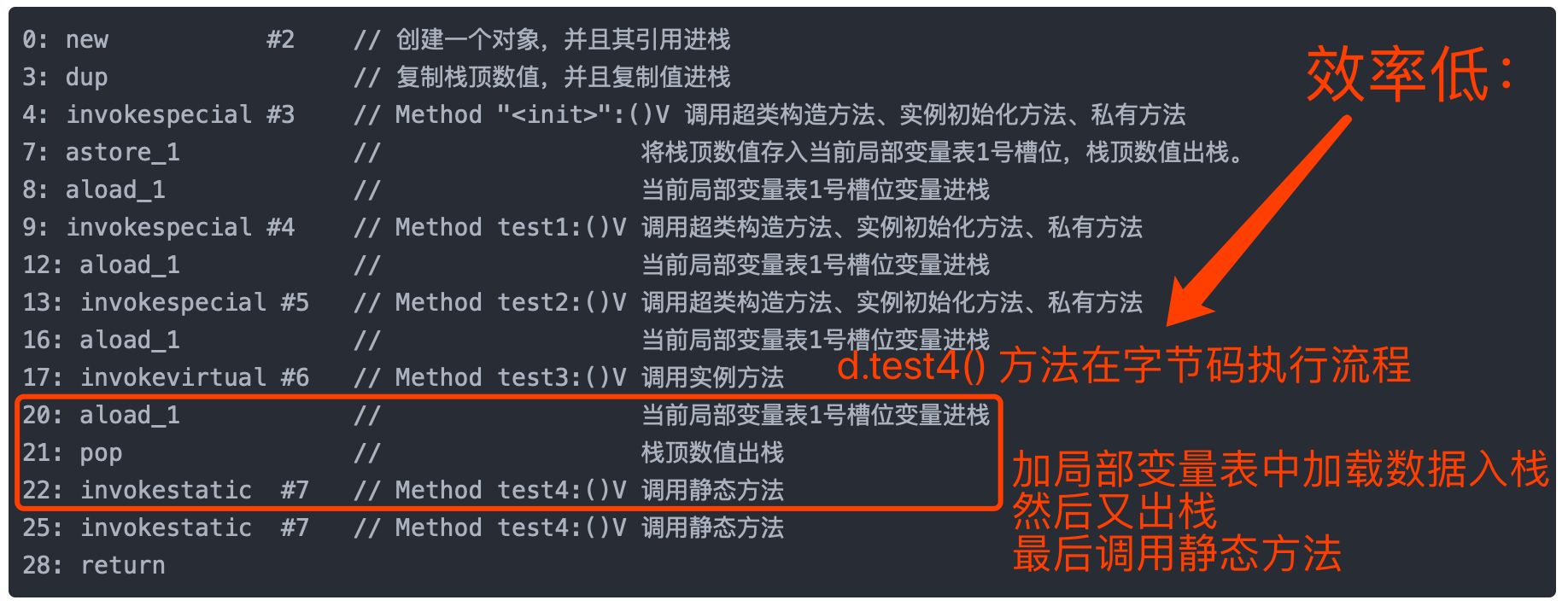 上述需要特别注意的是:通过实例对象.调用静态方法,在字节码层面角度可以看到入栈又出栈,效率低下。