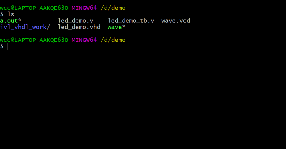 通过iverilog -o wave led_demo_tb.v led_demo.v命令,对源文件和仿真文件,进行语法规则检查和编译。由于本示例比较简单,只有1个文件,如果调用了多个.v的模块,可以通过前面介绍的-y参数指定源文件的路径,否则编译报错。如果源文件都在同同一个目录,可以直接通过./绝对路径的方式来指定。