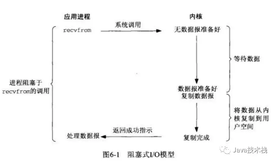 阻塞I/O下请求无法立即完成则保持阻塞,阻塞I/O分为如下两个阶段。