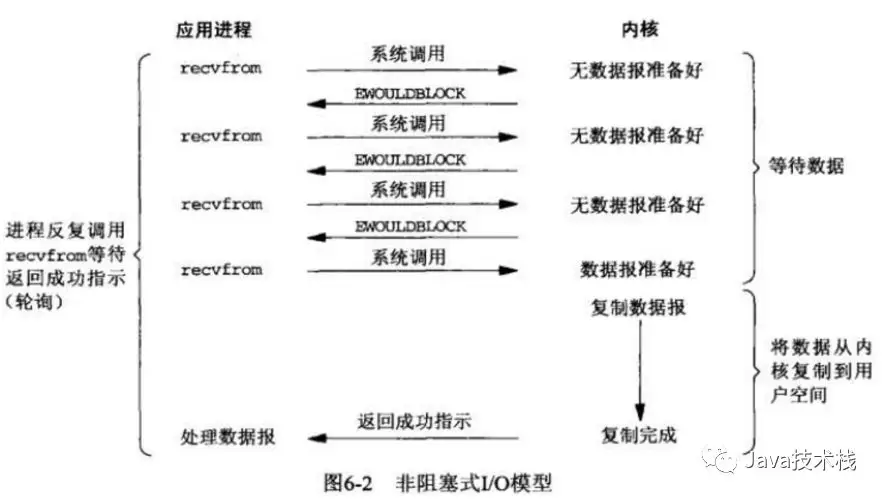 就是阶段1的时候用户进程可选择做其他事情,通过轮询的方式看看内核缓冲区是否就绪。如果数据就绪,再去执行阶段2。