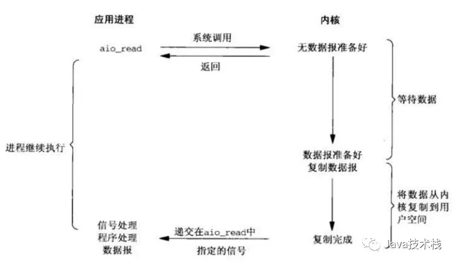 相对于同步IO,异步IO不是顺序执行。用户进程进行aio_read系统调用之后,无论内核数据是否准备好,都会直接返回给用户进程, 然后用户态进程可以去做别的事情。等到socket数据准备好了,内核直接复制数据给进程,然后从内核向进程发送通知。IO两个阶段, 进程都是非阻塞的。