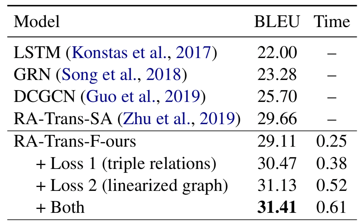 为了验证作者在三个图到文本的标准数据集(LDC2015E86,LDC2017T10,WebNLG)上进行验证,分别取得了2.4+ BLEU score的提升,分别见表1、2、3,更多分析结果请参考原文
