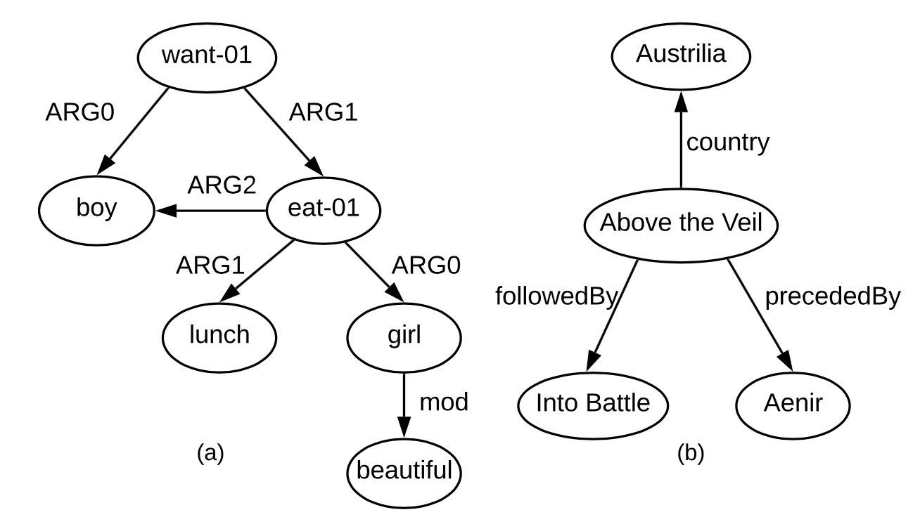 图到文本生成(graph-to-text generation)任务有着广泛的潜在应用,并且已经被应用在机器翻译等任务中。下图显示了两种图结构(语义图和知识图谱),分别表示“The boy wants the beautiful girl to eat lunch with him.”和“Above the Veil is an Australian novel and the sequel to Aenir. It was followed by Into the Battle.”