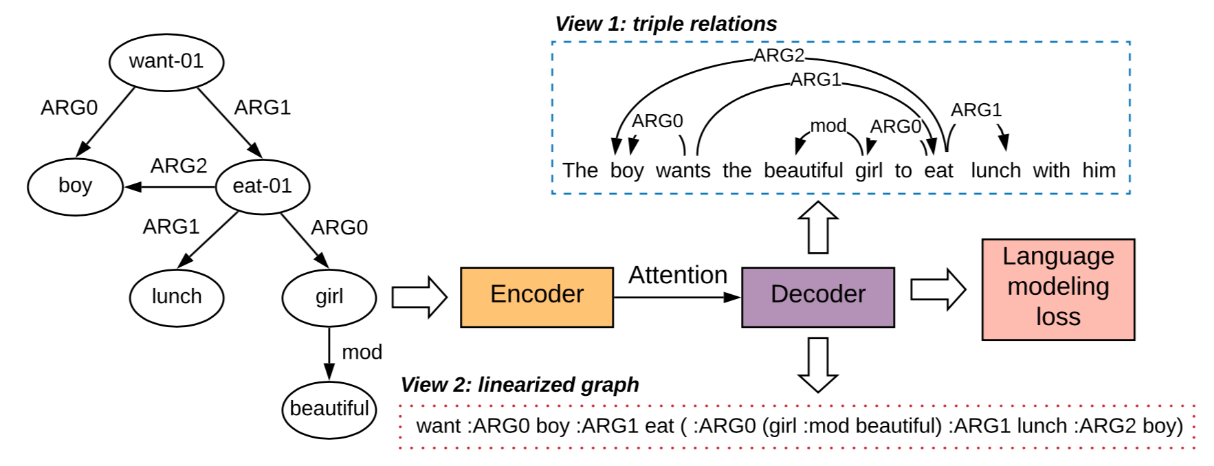 本文提出了一种通用的基于“多视角重建”的损失函数来辅助模型训练。总的来说,我们提出了多种方法把输入的图投射到目标句子端,让解码器不仅学习输出目标句子,还要输出投射的图结构,这样能够迫使模型在做生成的时候更好的记住输入内容。